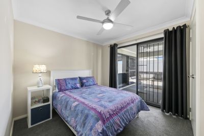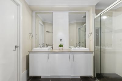 - Sleek luxurious and spacious main bedroom located at the rear of the home for privacy features glass slider with direct access to the back patio with light and airy feel, roller blinds, ceiling fan, plush carpet, dual his and hers walk-in robes fitted with shelving, fresh ensuite with stone vanity with dual sinks, huge shower, separate toilet and stainless fittings