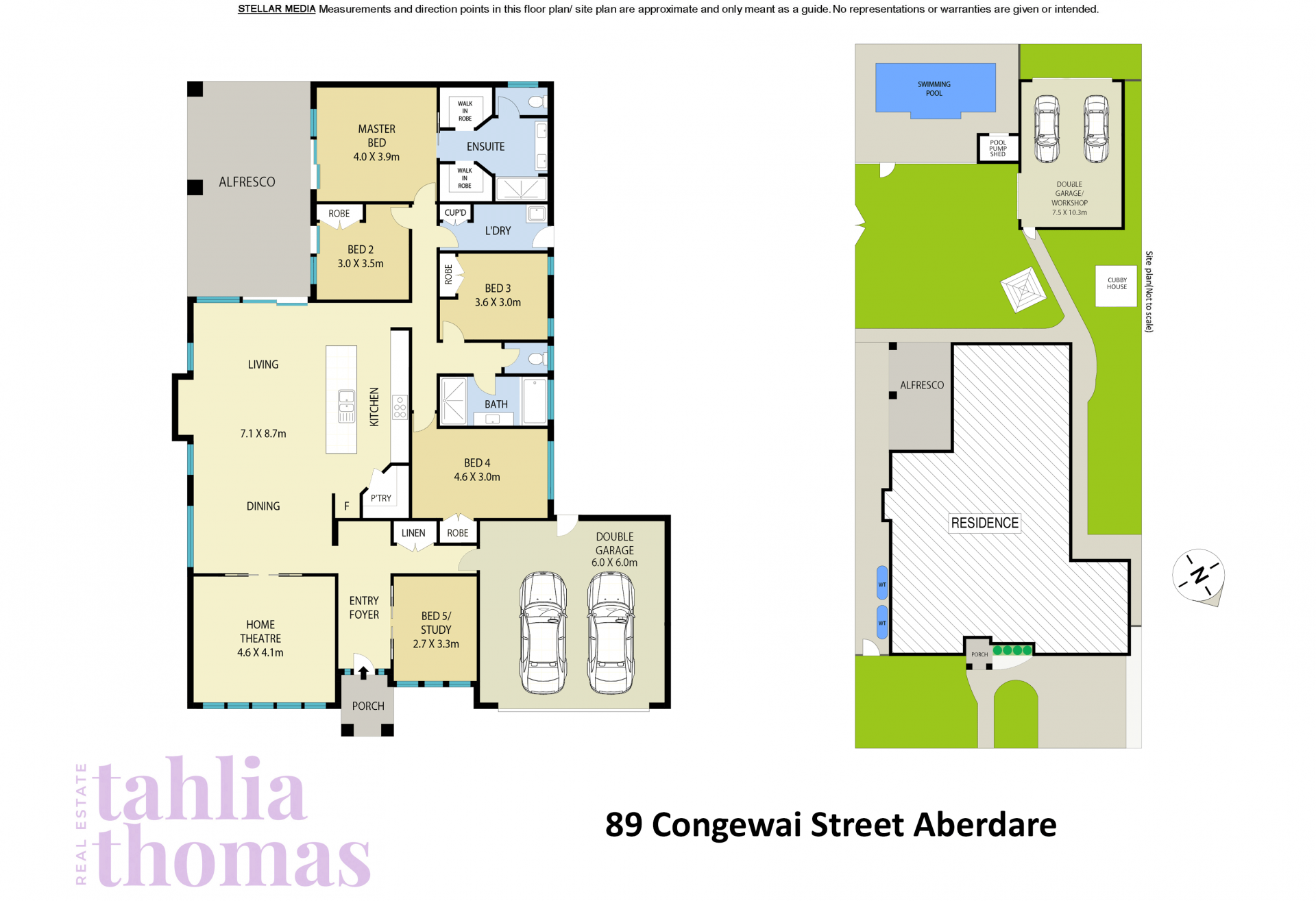 - Five bedrooms, three fitted with built-in robes, all with fans and plush carpet to floors, master with huge his and hers walk-in robes and ensuite with separate toilet, fifth bed or study located of the front foyer of the home perfect for working from home