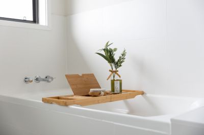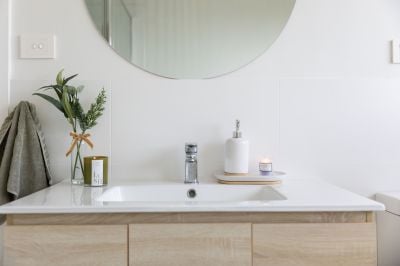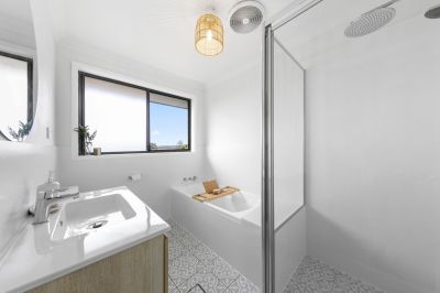- Modern main bathroom freshly renovated with large shower with storage alcove, floating vanity, gorgeous soaking tub, quality on trend tiling, round overhead mirror with lighting and stainless fittings