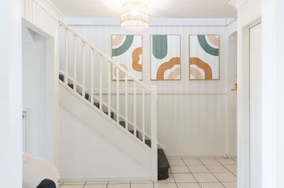 - Light-filled living area with large windows soaking in natural light and greenery is located on the lower level of the home, has reverse-cycle air-conditioning and connects to the kitchen and dining area, second toilet on the ground floor