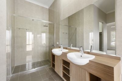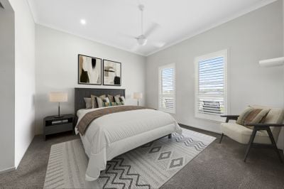 - Sleek luxurious and huge main bedroom located at the front wing of the home for privacy features large windows letting in lots of natural light, plantation shutters, ceiling fan, plush carpet, dual his and hers walk-in robes fitted with shelving, ensuite with his and hers basins and large shower, soaring 3.3m ceilings and connection to the the theatre room and home office within the front wing of the home