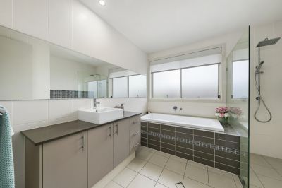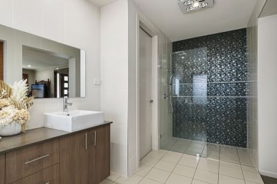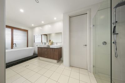 - Sleek luxurious and spacious main bedroom located at the front of the home for privacy features floor to ceiling windows with light and airy view, plantation shutters, ceiling fan, plush carpet floor, large built-in robes along one full wall, huge and absolutely stunning ensuite with huge shower, semi-freestanding soaking tub, stone vanity with dual basins and separate toilet