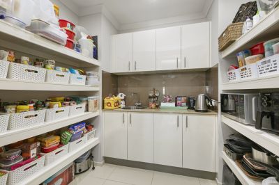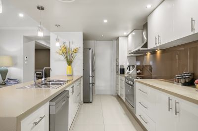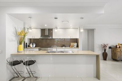 - Gorgeous open plan stone kitchen is at the centre of the home with glass splashback and stainless steel appliances including dishwasher, electric cooking, breakfast bar, double fridge space, huge walk-in pantry, downlights and gorgeous overhead pendant lighting