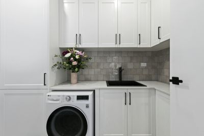 - Spacious laundry with stone benchtops, gorgeous splashback that ties in to match the kitchen, built-in matte black sink and fittings and gorgeous shaker cabinetry