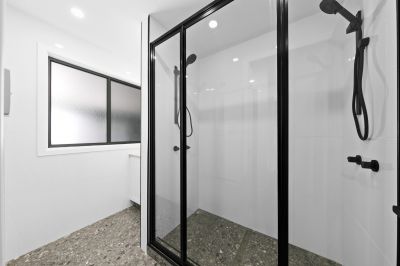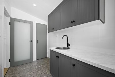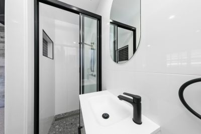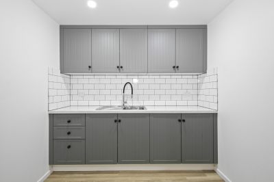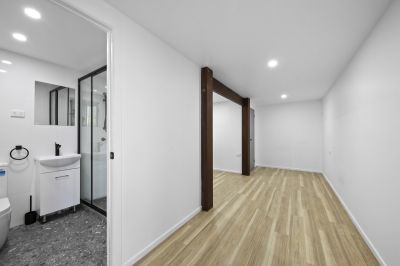 -Studio within colourbond garage features third kitchen and third bathroom, floating floors and LED downlights